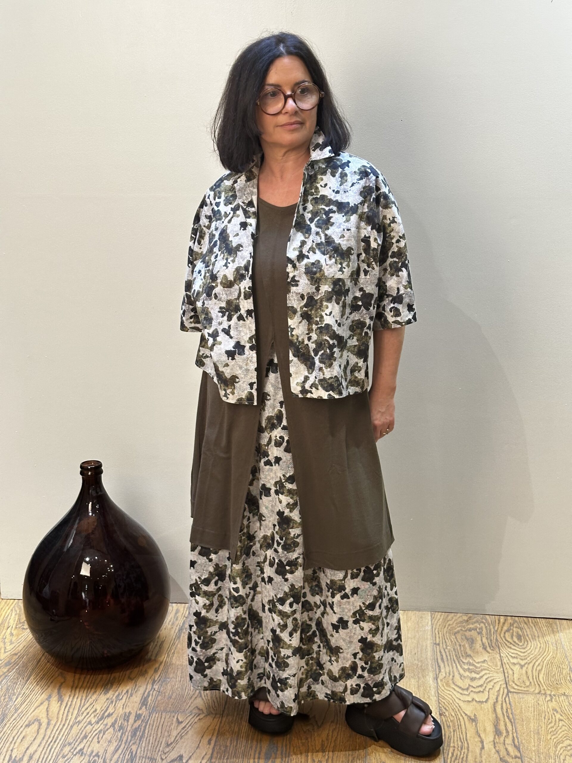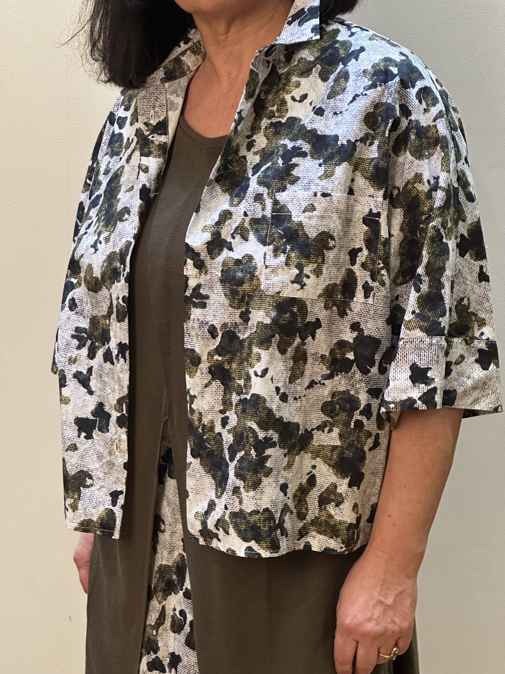 Imprimé Signature : Un motif abstrait aux nuances de noir, olive et gris sur fond blanc cassé, évoquant une esthétique brute et organique.