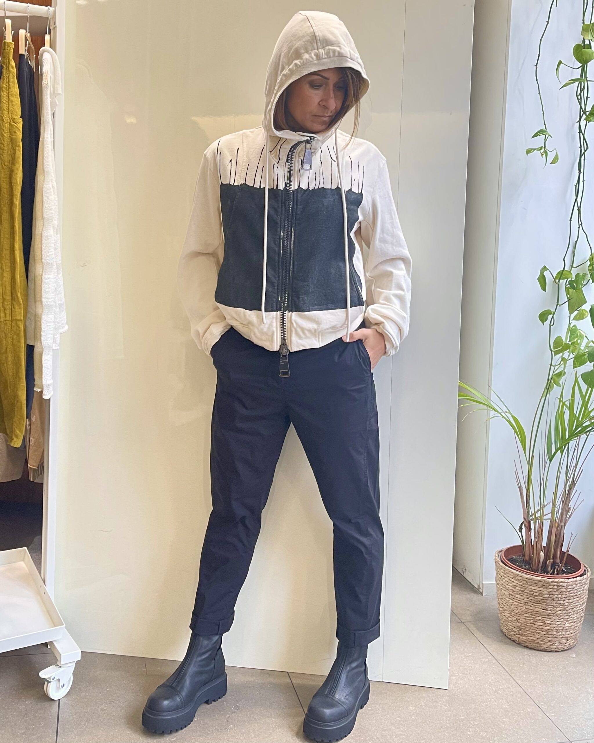 Réalisé dans une toile de coton technique à la tenue impeccable, il offre un tombé net et une main légèrement satinée, typique des créations Rundholz où confort et exigence textile se rencontrent. L’absence de détails superflus met en valeur la pureté de la ligne, soulignée par des finitions impeccables et des ourlets délicatement retroussés qui apportent une touche décontractée maîtrisée.
