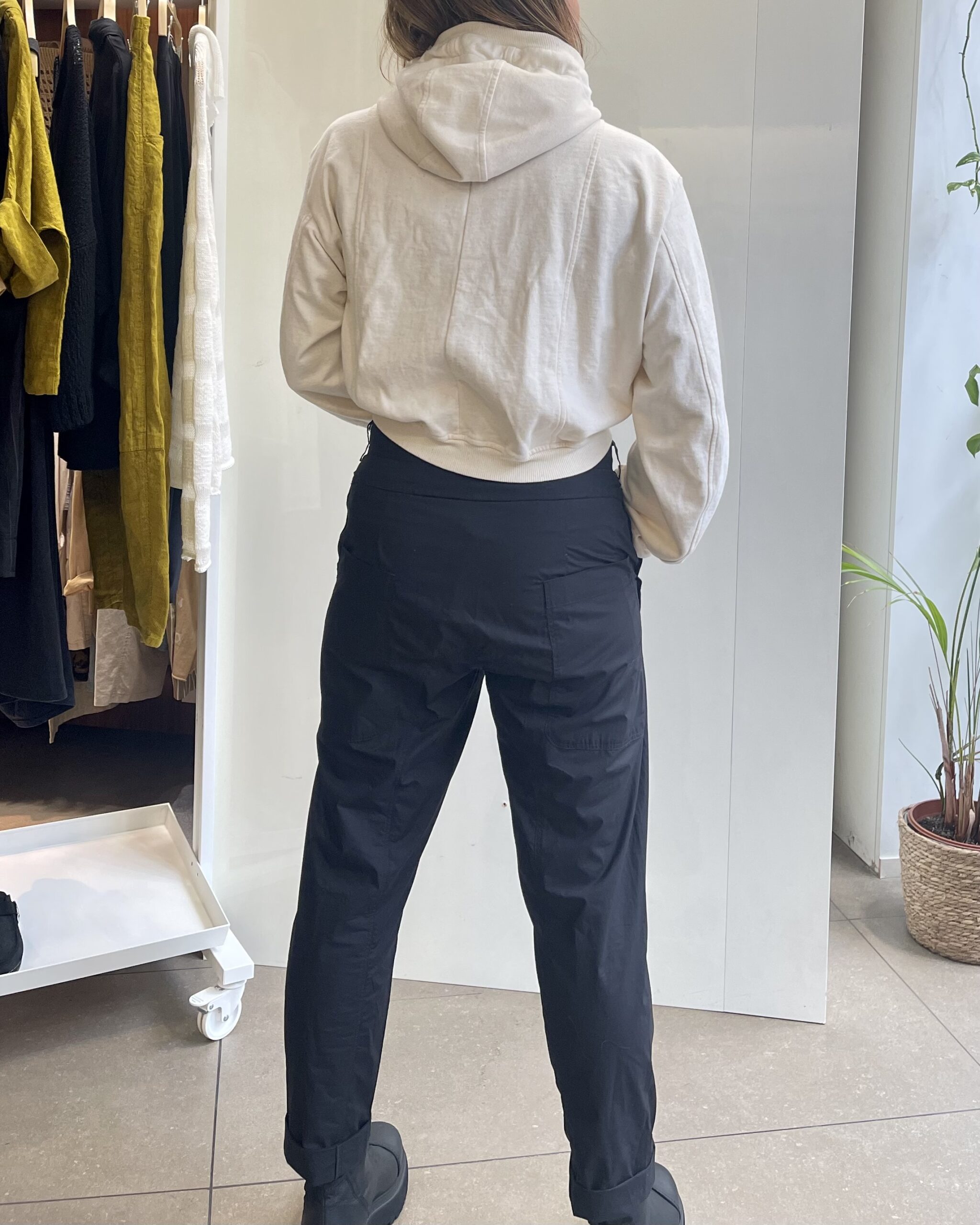 Conçu dans une ligne ajustée et fuselée, il épouse la silhouette avec justesse sans jamais la contraindre. Sa taille mi-haute structure la posture, tandis que la jambe, légèrement resserrée vers la cheville, allonge visuellement la silhouette pour une allure élancée et contemporaine.
