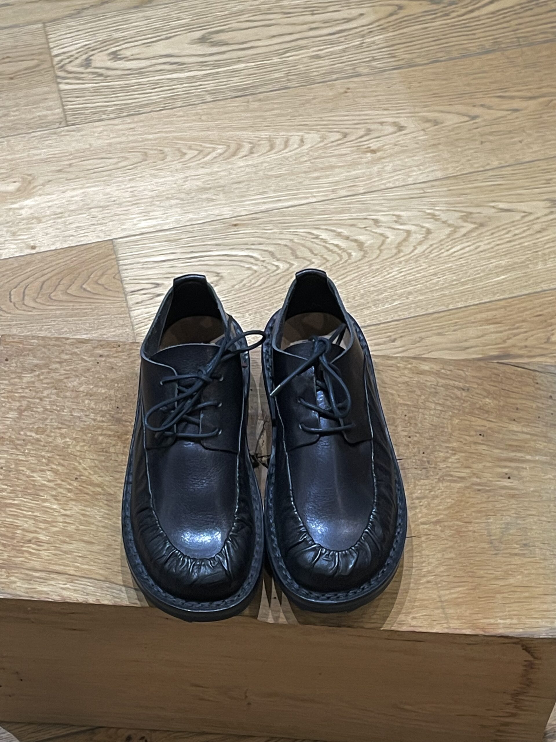 Réalisée en cuir noir souple à la finition légèrement patinée, elle se distingue par son bout arrondi souligné d’un plissé marqué, apportant relief et caractère.