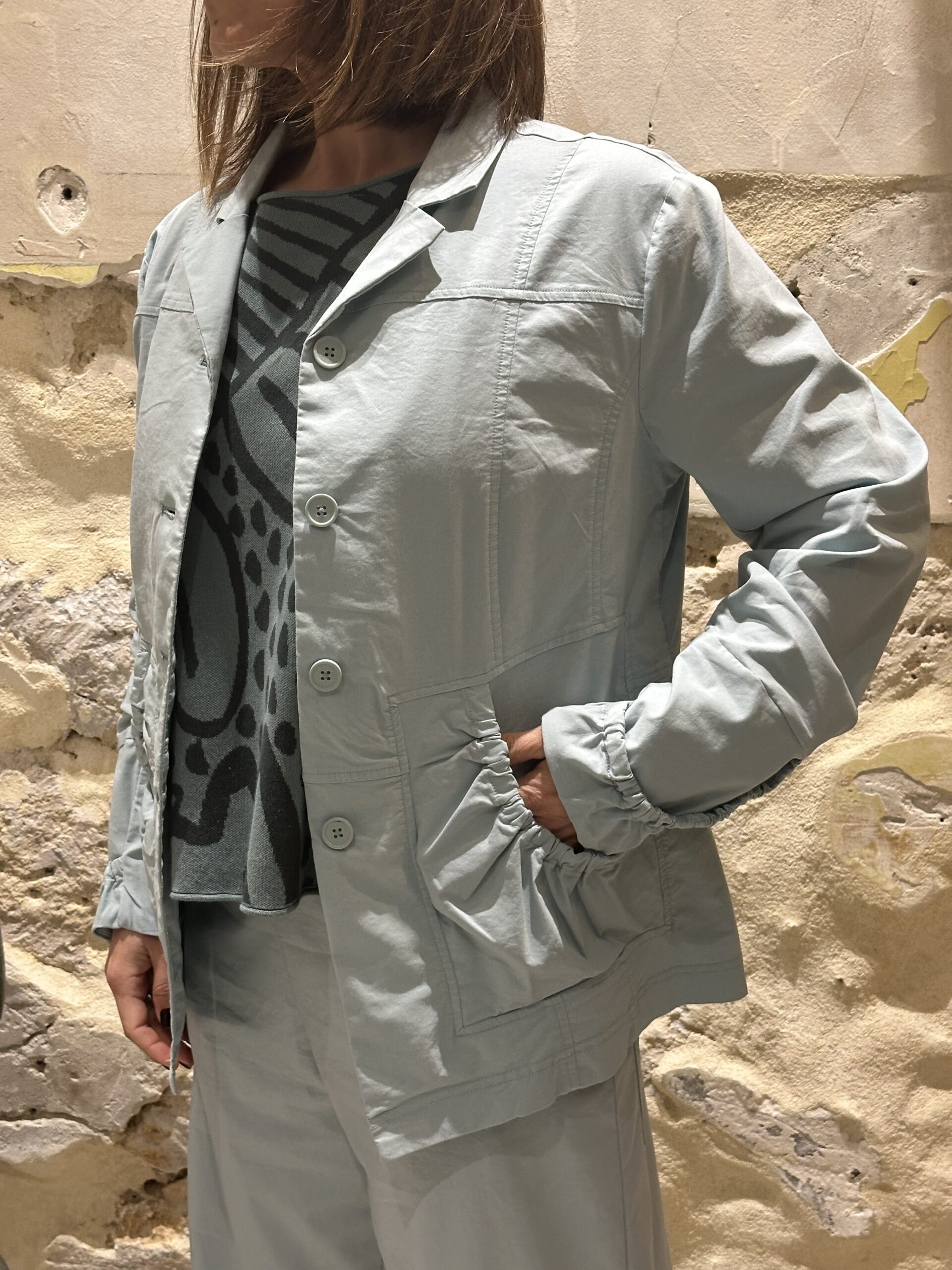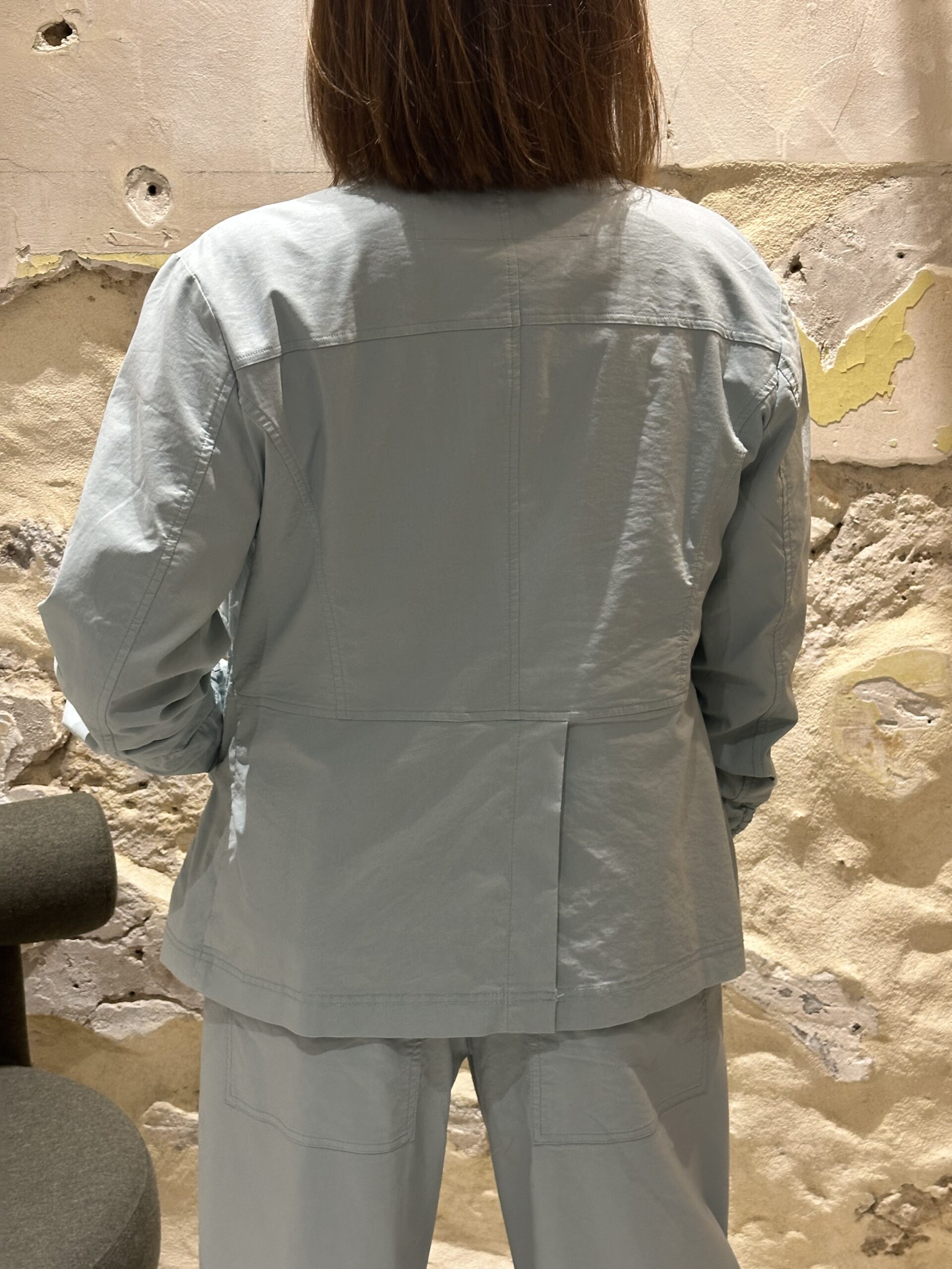 Affirmez votre style avec cette veste structurée au design singulier et épuré. Sa nuance « Mint Arc », un bleu-vert clair frais et lumineux, en fait une pièce maîtresse pour une silhouette moderne et sophistiquée.