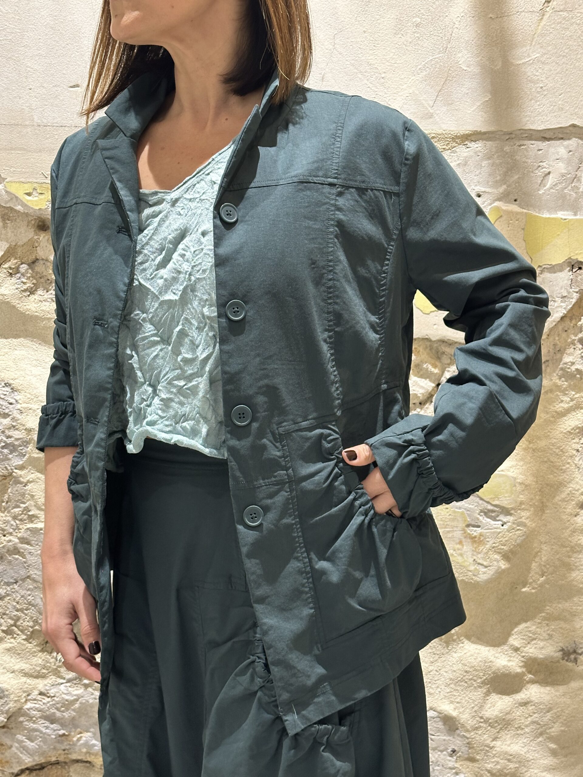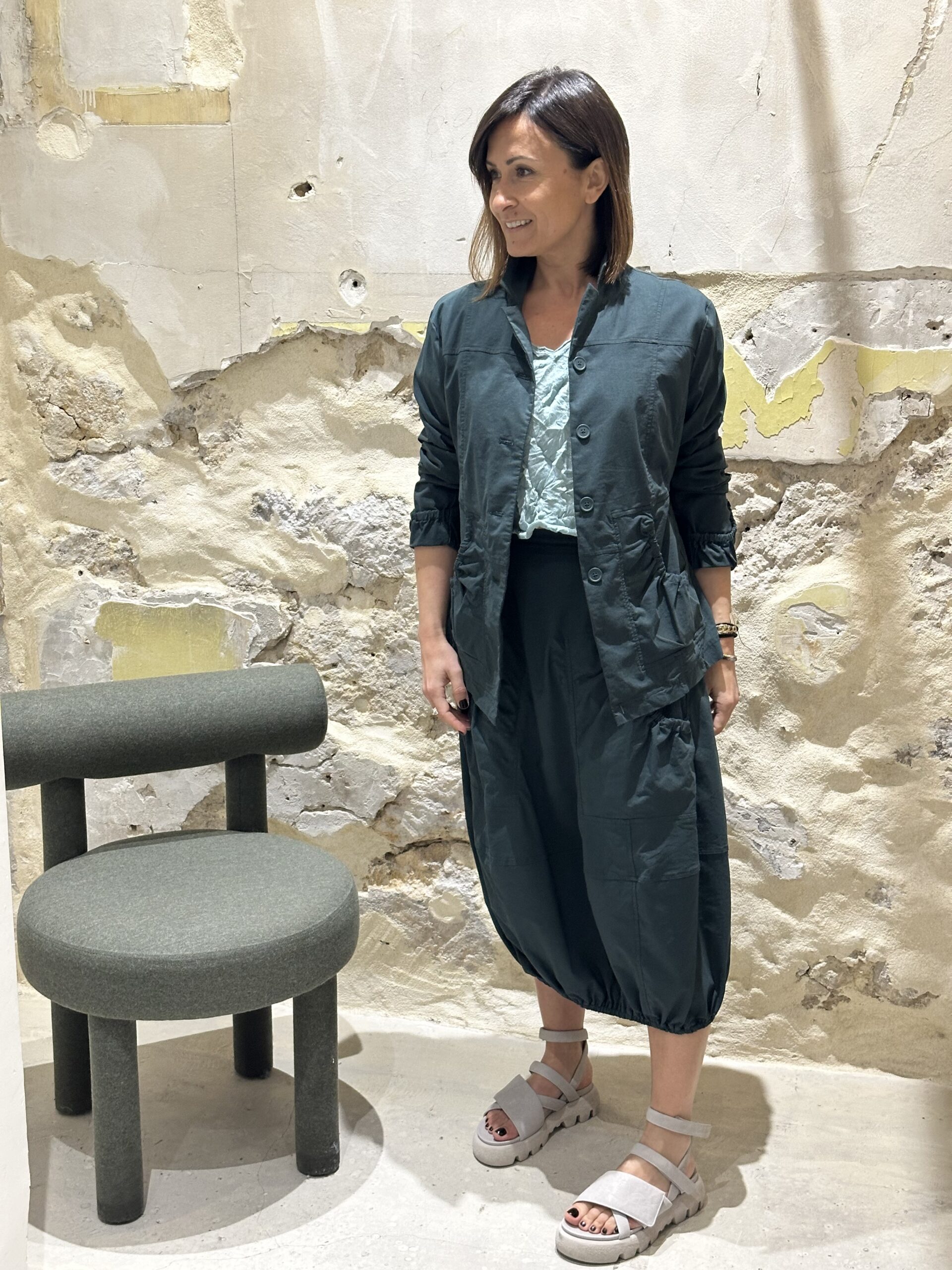 Complétez votre silhouette avec cette veste structurée au design singulier, conçue pour répondre parfaitement à la jupe « boule ». Dans sa nuance « Tree », un vert forêt profond, elle incarne une sophistication moderne et utilitaire, idéale pour superposer vos tenues avec style.