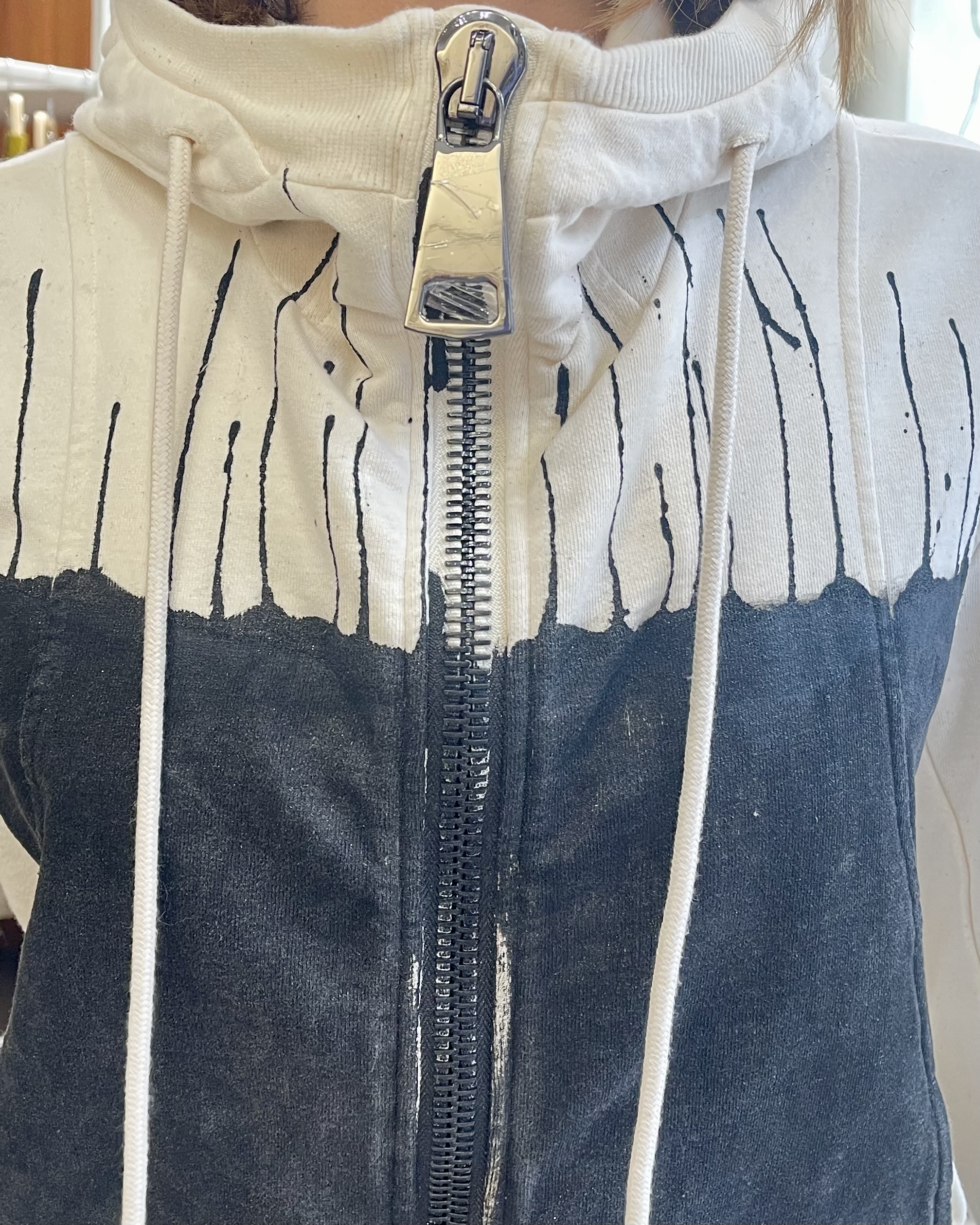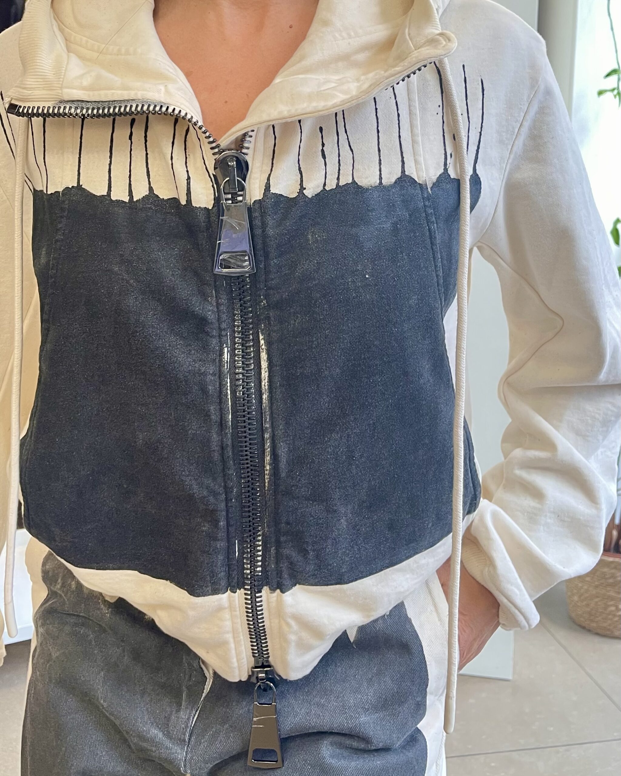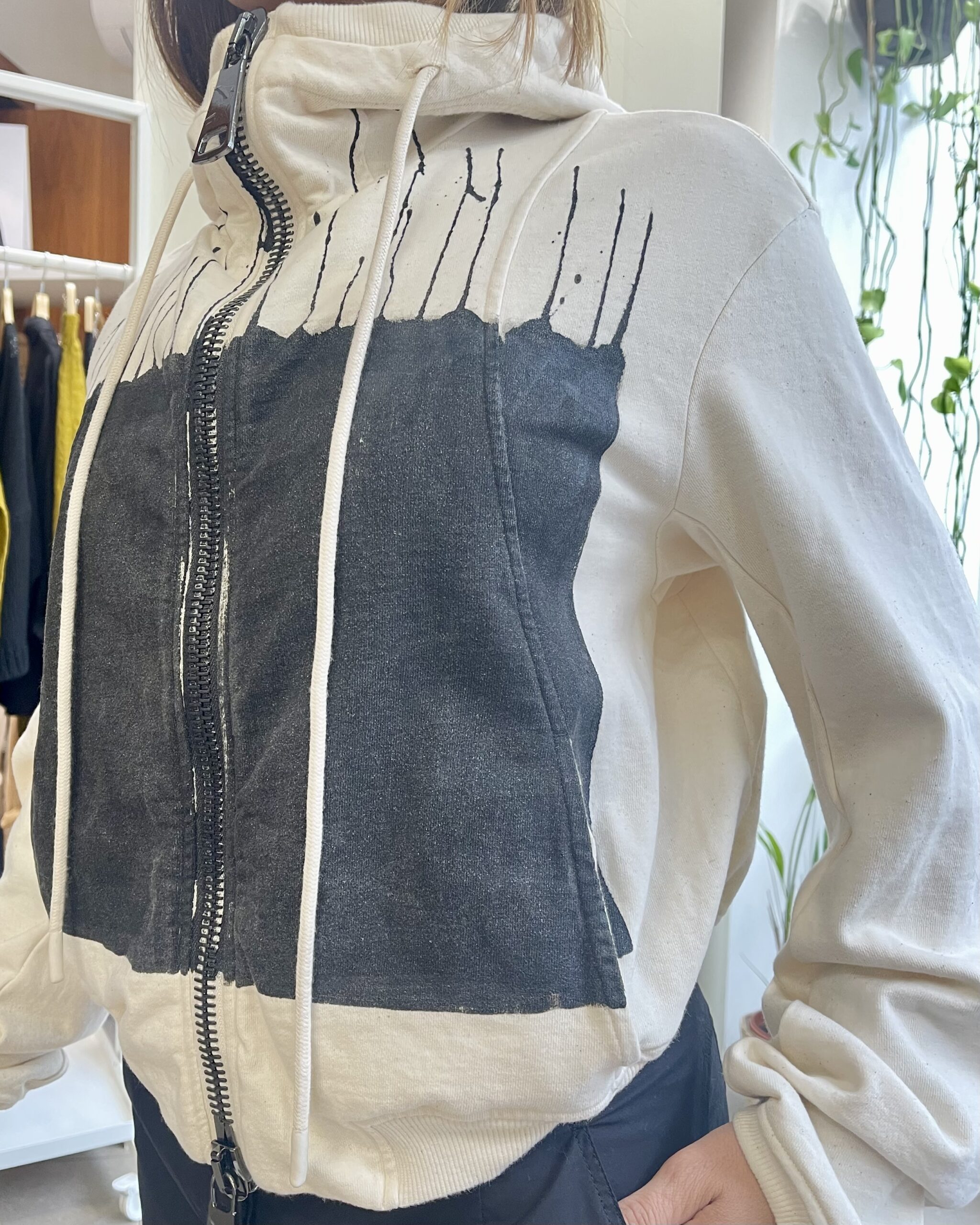Dotée d’une fermeture zippée intégrale à double curseur, elle offre une grande liberté de style et de mouvement. La capuche avec cordons de serrage renforce son esprit casual, tandis que les poches discrètes sur les côtés ajoutent une fonctionnalité pratique au quotidien.